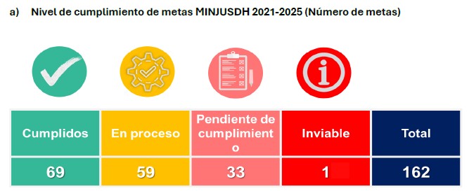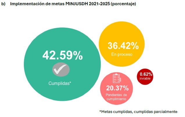 El 4 de diciembre de 2025, Diego Reátegui Rengifo,director de Políticas y Gestión en Derechos Humanos del MINJUSDH, atendió nuestra solicitud y nos informó que “(…) de las 162 Metas en las cuales el MINJUSDH se encuentra involucrado, se reporta un nivel de avance de: 69 metas cumplidas (42.59 %), 59 metas en proceso (36.42 %), 33 metas pendiente de cumplimiento (20.37%), y 1 meta inviable (0.62 %)”.[13]