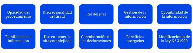 Se identificaron diez tópicos que conviene abordar para mejorar el funcionamiento de la medida a partir de los testimonios recabados de diversos actores del ámbito público, como operadores del Ministerio Público, el Poder Judicial, las Procuradurías públicas relacionadas a casos de corrupción, así como del sector privado con abogados defensores y especialistas de la academia. Presentamos esos tópicos en la siguiente imagen: